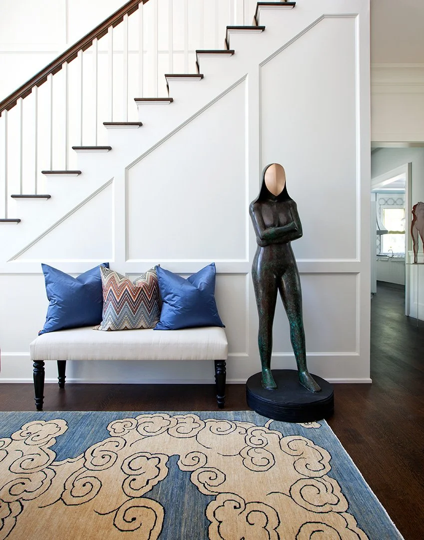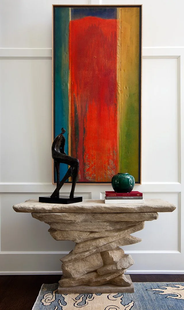 It came by accident when I found a 3 tiered antique chandelier at English Country Antiques in Bridgehampton. From there, I found bold art pieces from New York City to Sag Harbor. A special center table from Gregorius Pineo anchors the amazing blue indigo rug from Amadi Carpets.