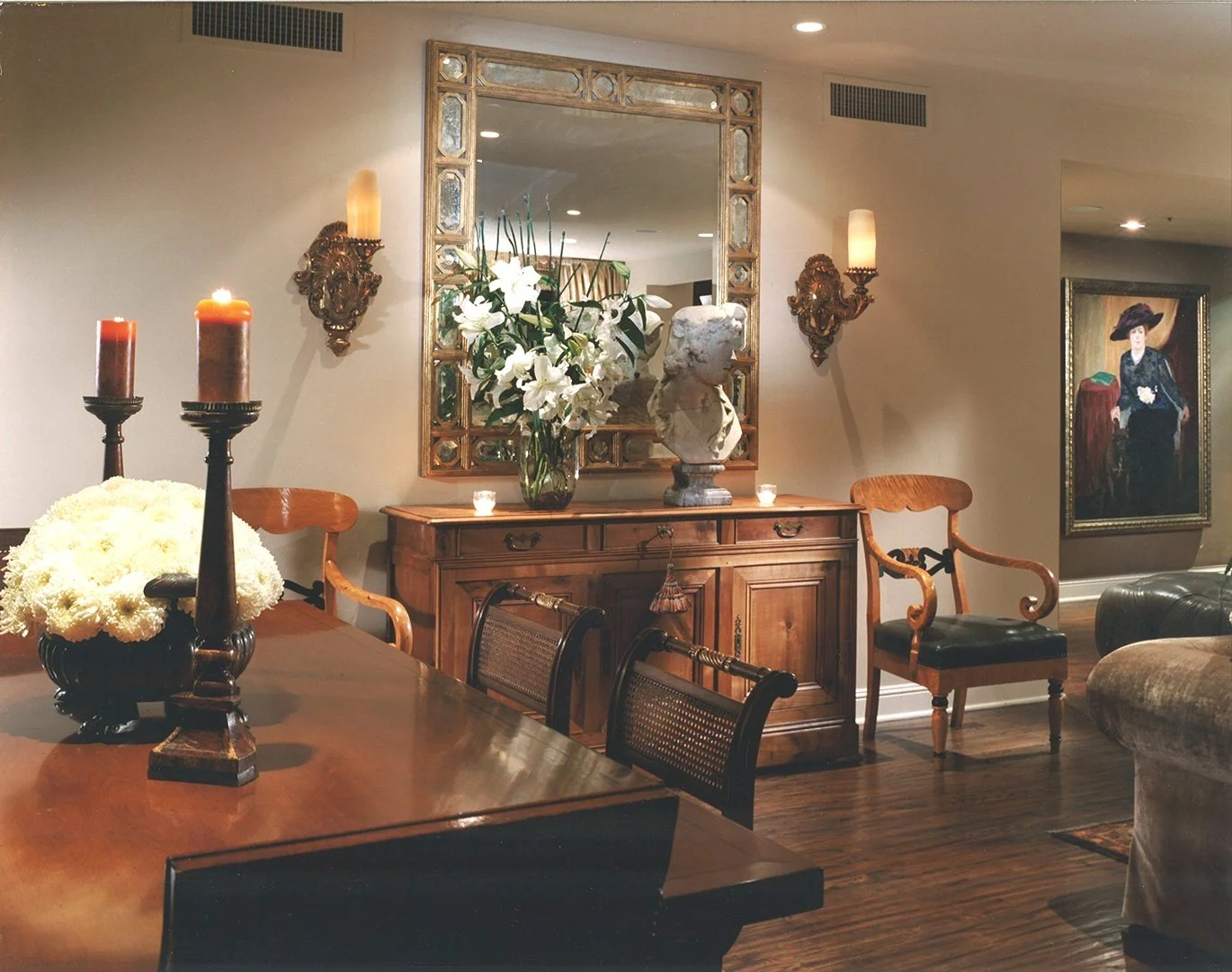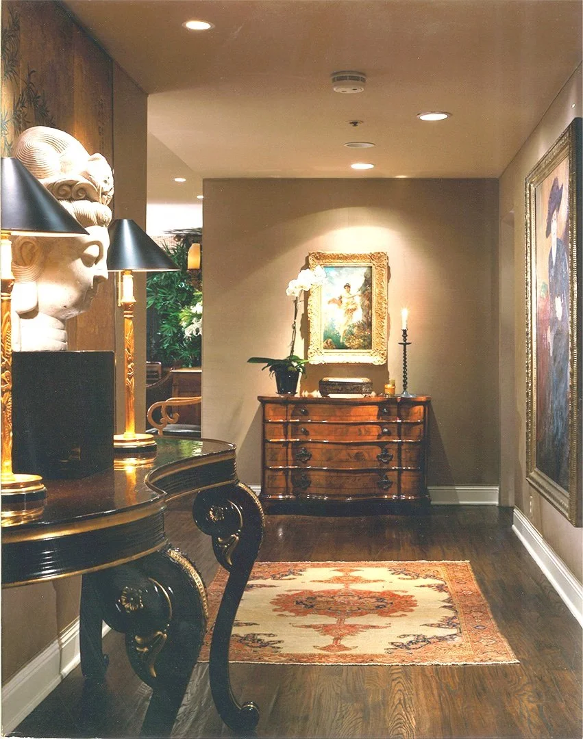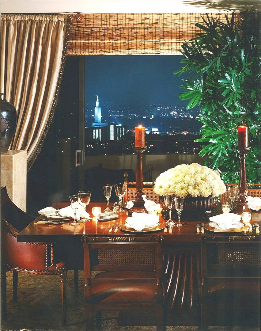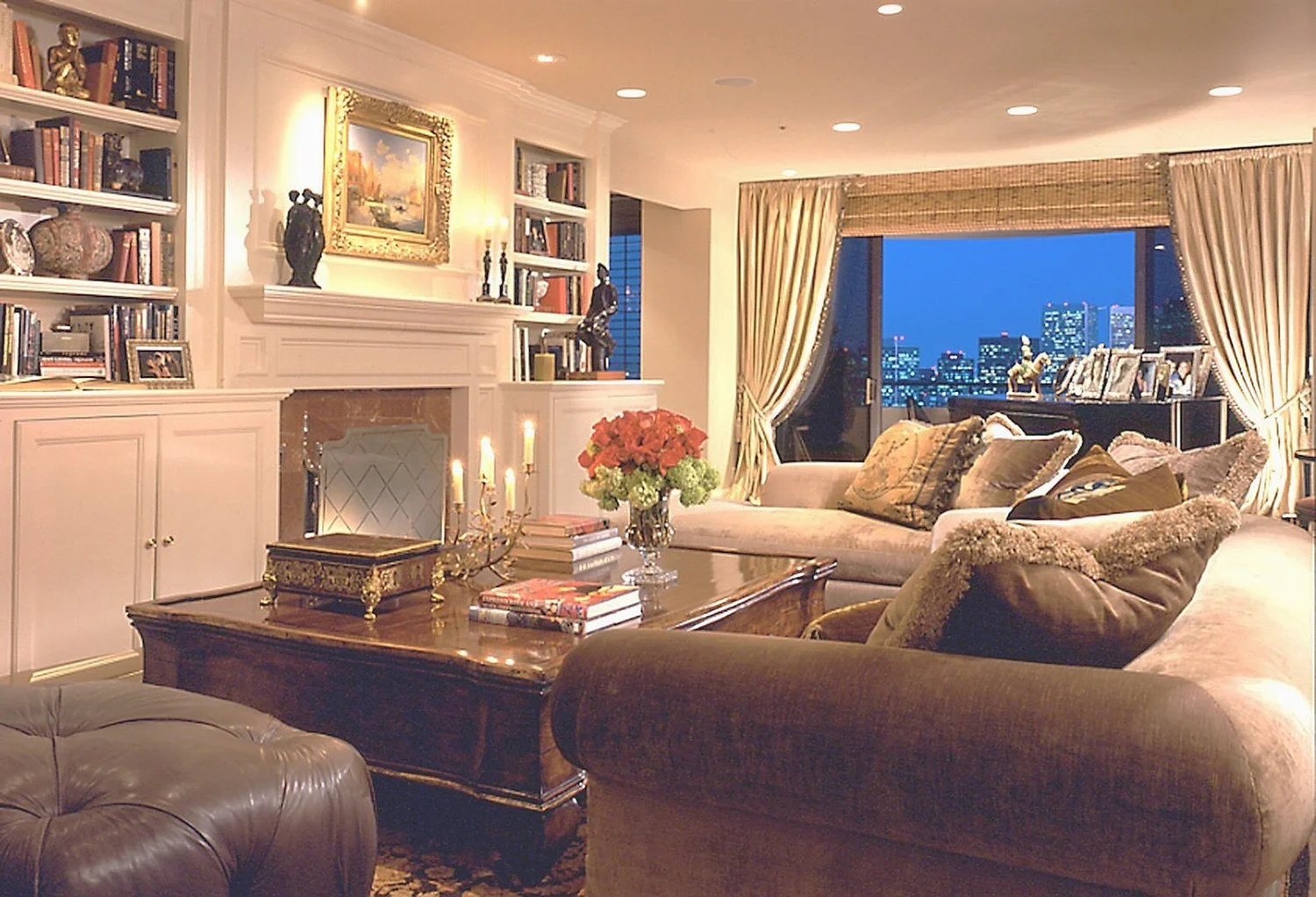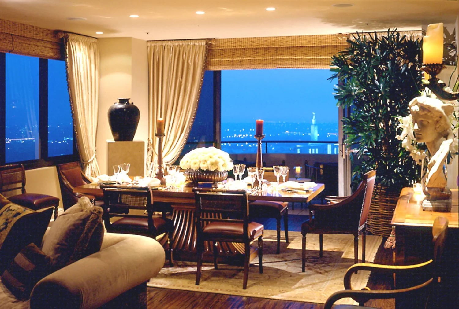Featured in Architectural Digest’s Top 100, are the muted hues and dramatic lighting that have been combined with Asian accents in these striking interiors. Full height terrace doors offer glamorous evening vistas of Century City and Los Angeles. Crisp white woodwork contrasts the dark hand-scraped hardwood floors.